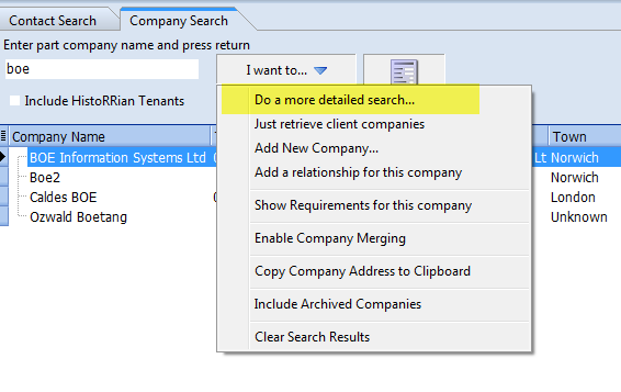 Working for companies works in a very similar way to searching for contacts. You simply select the "Company Search" tab, type in part of the name, and press "Enter".