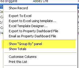 In the Property Search screen, for example, you can right-click on the search results and choose "Show 'Group By' Panel".